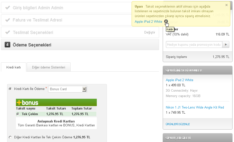 Örneğin: Garanti bankasından sanal pos hizmeti ve firmamızdan Garanti bankası için CS-Cart taksit destekli sanal pos modülü satın aldığınızda Bonus kartı olan müşterilerinize taksit seçenekleri sunabilirsiniz diğer bankalardan kredi kartları olan müşterileriniz sitenizde tek çekim ödemeyi seçerek ödemesini istediği banka kredi kartı ile tek çekim olarak gerçekleştirebilir.