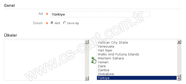 Ülkeler bölümünde: Sağ taraftaki ülkelerden Türkiye yi işaretleyip sol kutucuğu gösteren Yeşil ok butonuna tıklayarak Türkiyeyi ülkeler arasına ekleyiniz.